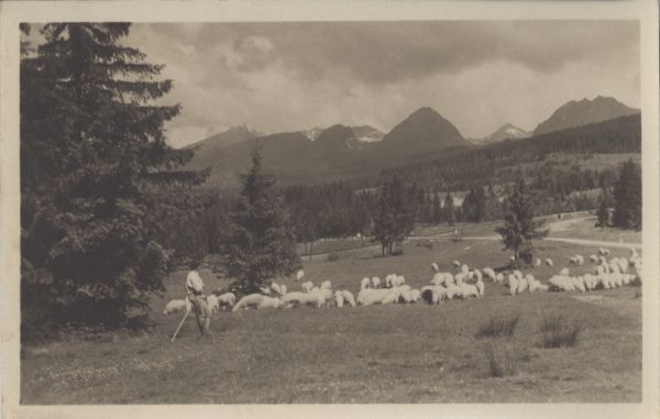 Owce pasące się na łące w Szczyrbie. W tle Krywań, Krótka, Ostra, Wielkie Solisko, Szczyrbski Szczyt i Skrajna Baszta.
