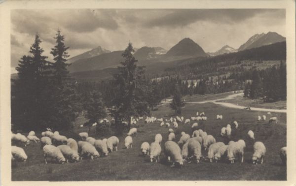 Widok na owce pas±ce się na ł±ce w Szczyrbie. W tle Krywań, Siodełkowa Kopa, Wielkie Solisko, Szczyrbski Szczyt i Skrajna Baszta.