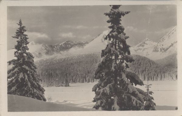Zamarznięta tafla Szczyrbskiego Jeziora. Na pierwszym planie ośnieżone świerki, w tle od lewej Krywań, za świerkiem Solisko i Szczyrbski Szczyt.