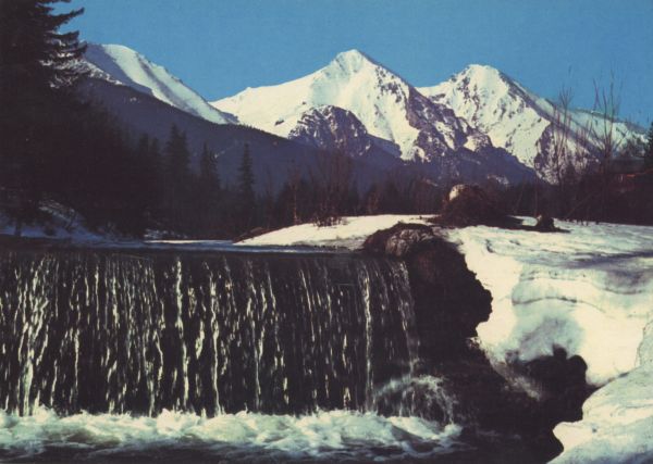 Zimowy widok ze wsi Zdziar na Tatry Bielskie. Na pierwszym planie wodospad na Bielskim Potoku. W tle po lewej Płaczliwa Skała po prawej Hawrań.