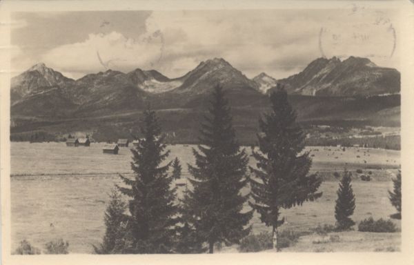 Panorama Tatr Wysokich z Ważeckich Łąk od lewej: Krywań, Krótka, Ostra, Wielkie Solisko, Szczyrbski Szczyt, grań Baszt i Szatan. Na pierwszym planie świerki (Picea A. Dietr.). W głębi szałasy pasterskie.