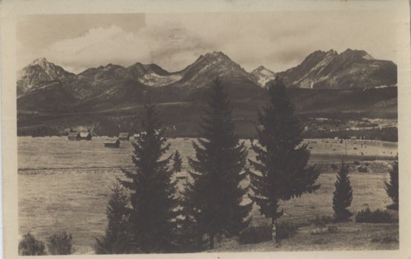Panorama Tatr Wysokich z Ważeckich Łąk od lewej: Krywań, Krótka, Ostra, Wielkie Solisko, Szczyrbski Szczyt, grań Baszt i Szatan. Na pierwszym planie świerki (Picea A. Dietr.). W głębi szałasy pasterskie.
