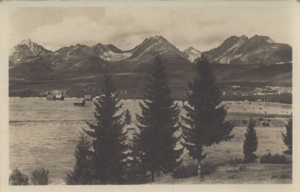 Panorama Tatr Wysokich z Ważeckich Łąk od lewej: Krywań, Krótka, Ostra, Wielkie Solisko, Szczyrbski Szczyt, grań Baszt i Szatan. Na pierwszym planie świerki (Picea A. Dietr.). W głębi szałasy pasterskie.