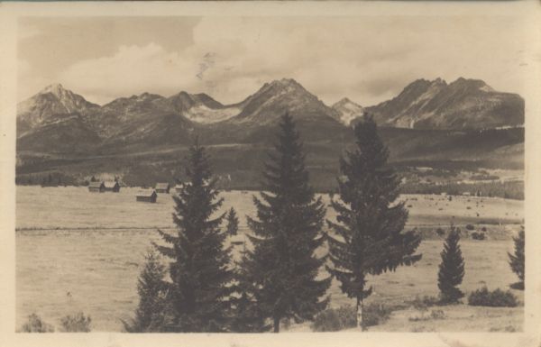 Panorama Tatr Wysokich z Ważeckich Łąk od lewej: Krywań, Krótka, Ostra, Wielkie Solisko, Szczyrbski Szczyt, grań Baszt i Szatan. Na pierwszym planie świerki (Picea A. Dietr.). W głębi szałasy pasterskie.