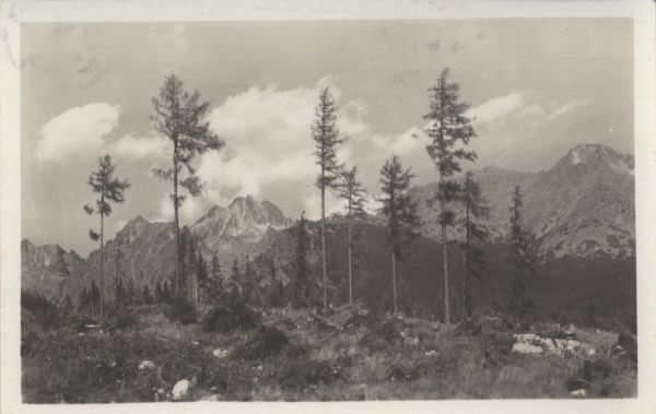 Na pierwszym planie grupka wysokich świerków. W tle pejzaż Tatr Wysokich. Widać: Wysoką, Popradzką Kopę, Osterwę, Tępą i Kończystą.