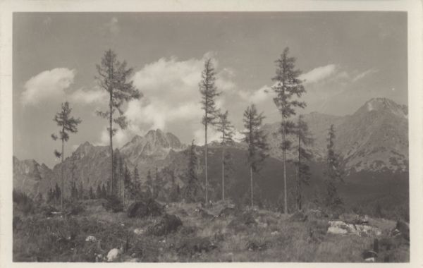 Na pierwszym planie grupka wysokich świerków. W tle pejzaż Tatr Wysokich. Widać: Wysoką, Popradzką Kopę, Osterwę, Tępą i Kończystą.