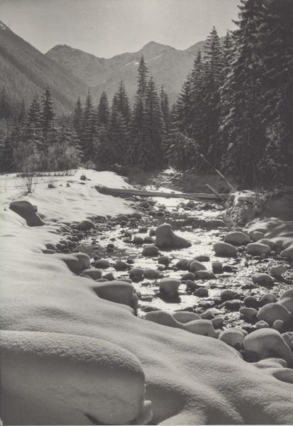 Na pierwszym planie górski potok. W tle zimowy pejzaż tatrzański.