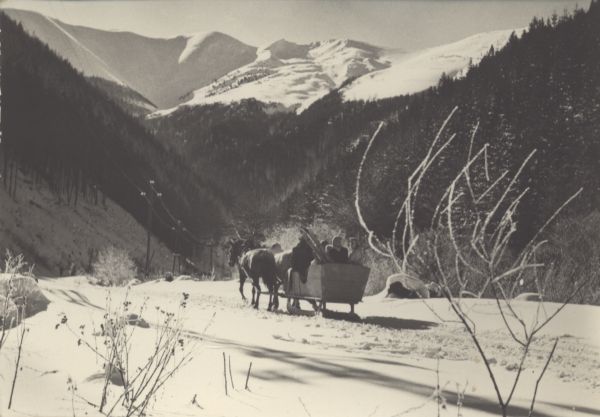 Na pierwszym planie sanie z turystami w dolinie. W tle zimowy tatrzański pejzaż.