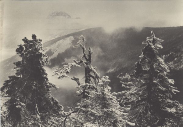 Pejzaż zimowy, na pierwszym planie drzewa.