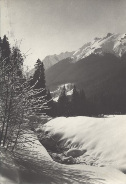 Zimowy pejzaż. Na pierwszym planie pokryty śniegiem potok. W tle szczyty.