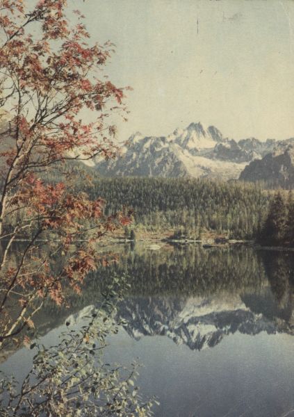 Na pierwszym planie tafla Szczyrbskiego Jeziora. Po lewej stronie jarzębina (sorbus aucuparia). W tle widać Wysoką. Szczyt odbija się w stawie.