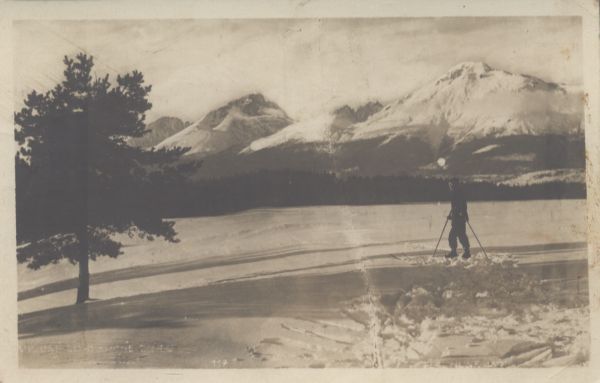 Zimowy pejzaż. Na pierwszym planie po lewej stronie samotne drzewo, po prawej narciarz, w głębi las. W tle ośnieżone szczyty: Gerlach, Granaty Wielickie i Sławkowski Szczyt. Na dole wpisany tytuł (nieczytelny).