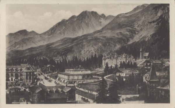 Pocztówka przedstawia miejscowość Stary Smokowiec. Na pierwszym planie zabudowania. W tle Sławkowski Szczyt.