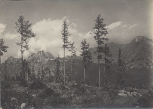 Drygant, widok na: Kopę Popradzką, Wysoką, Osterwę, Tępą i Kończystą. Na pierwszym planie pojedyncze drzewa.