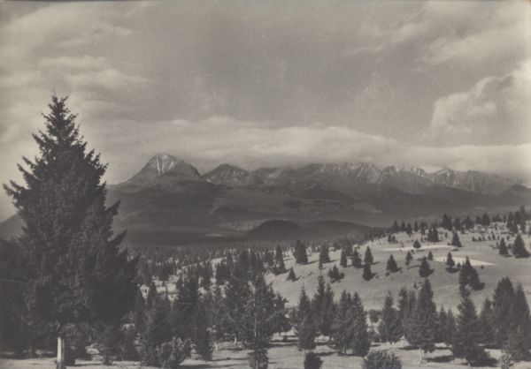 Widok na Tatry Wysokie od zachodu. Na pierwszym planie po lewej świerk (Picea A. Dietr.), wgłębi las. W tle szczyty, pierwszy po lewej Krywań.