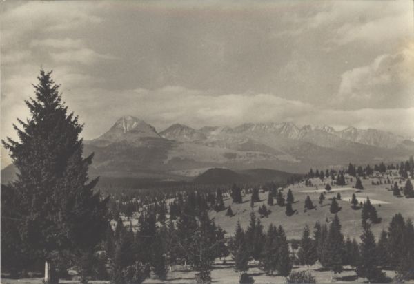 Widok na Tatry Wysokie od zachodu. Na pierwszym planie po lewej świerk (Picea A. Dietr.), wgłębi las. W tle szczyty, pierwszy po lewej Krywań.