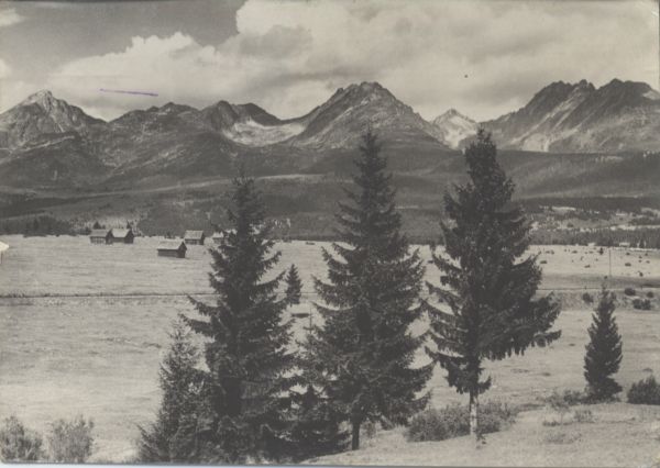 Panorama Tatr Wysokich z Ważeckich ٱk od lewej: Krywań, Krótka, Ostra, Wielkie Solisko, Szczyrbski Szczyt, grań Baszt i Szatan. Na pierwszym planie ¶wierki (Picea A. Dietr.). W głêbi szałasy pasterskie.