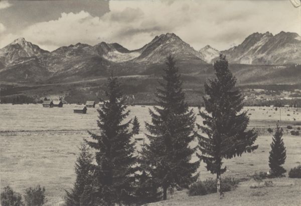 Panorama Tatr Wysokich z Ważeckich ٱk od lewej: Krywań, Krótka, Ostra, Wielkie Solisko, Szczyrbski Szczyt, grań Baszt i Szatan. Na pierwszym planie ¶wierki (Picea A. Dietr.). W głębi szałasy pasterskie.