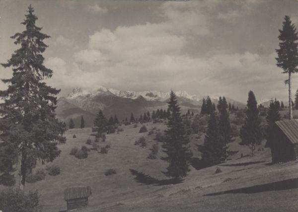 Widok na Tatry Wysokie od zachodu. Na pierwszym planie świerki (Picea A. Dietr.) i szałas, wgłębi las. W tle szczyty, pierwszy od lewej Krywań, Krótka i Ostra.