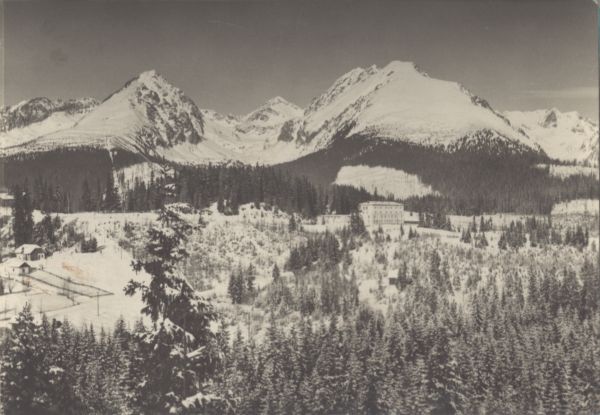 Zimowy widok na Szczyrbskie Jezioro. Na pierwszym planie drzewa, w głębi hotel. W tle od lewej: Ostra, Szczyrbskie Solisko, Dolina Młynicka nad ni± Szczyrbski Szczyt, grań Baszt ze Skrajn± Baszt±, Dolina Mięguszowiecka z Wołowym Grzbietem.