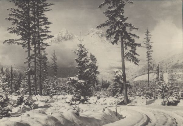 Widok na Łomnicę i Kieżmarski Szczyt z Matlar w scenerii zimowej. Na pierwszym planie droga i pojedyncze drzewa, w głębi las.