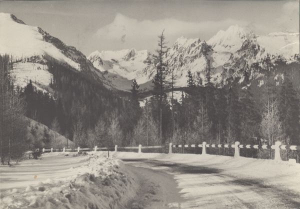 Widok z Drogi Wolności w scenerii zimowej na szczyty: Skrajną Basztę, Wołowy Grzbiet, Popradzką Kopę i Wysoką.