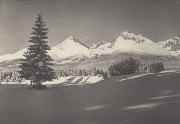 Widok na Kończyst±, Batyżowiecki Szczyt i Gerlach w scenerii zimowej. Na pierwszym planie drzewo. W głêbi las.