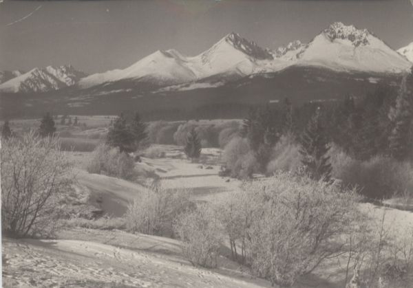 Panorama bocznej grani południowej czę¶ci Tatr Wysokich w scenerii zimowej. Od lewej: Grań Baszt, Tępa, Kończysta, Batyżowiecki Szczyt, Gerlach. Na pierwszym planie o¶nieżone krzewy.