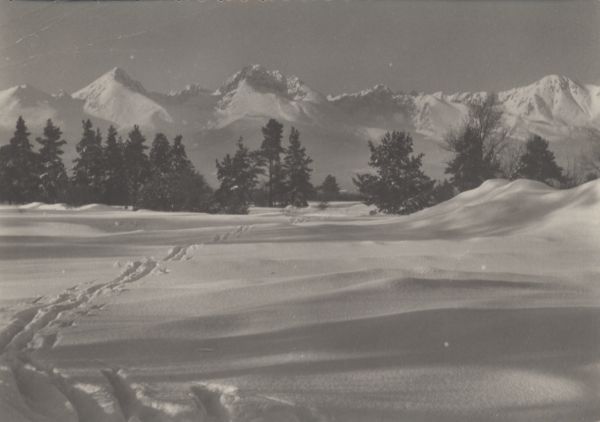 Widok na boczn± grań Tatr Wysokich z południa w scenerii zimowej. Od lewej: Tępa, Kończysta, Batyżowiecki Szczyt, Gerlach, Starole¶na i Sławkowski Szczyt.