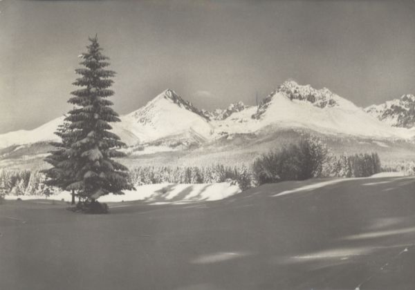 Widok na Kończyst±, Batyżowiecki Szczyt i Gerlach w scenerii zimowej. Na pierwszym planie drzewo. W głębi las.