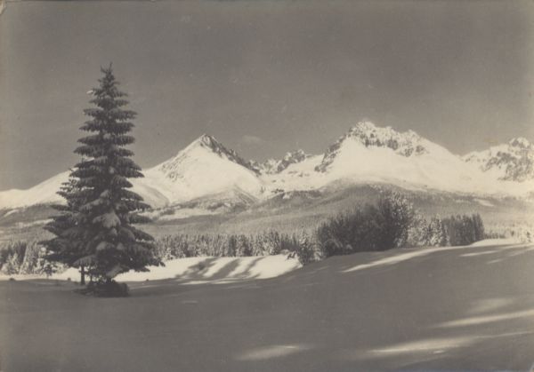 Widok na Kończyst±, Batyżowiecki Szczyt i Gerlach w scenerii zimowej. Na pierwszym planie drzewo. W głębi las.