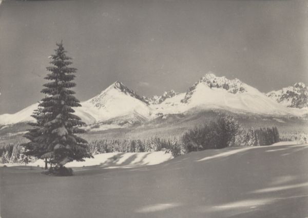 Widok na Kończyst±, Batyżowiecki Szczyt i Gerlach w scenerii zimowej. Na pierwszym planie drzewo. W głębi las.
