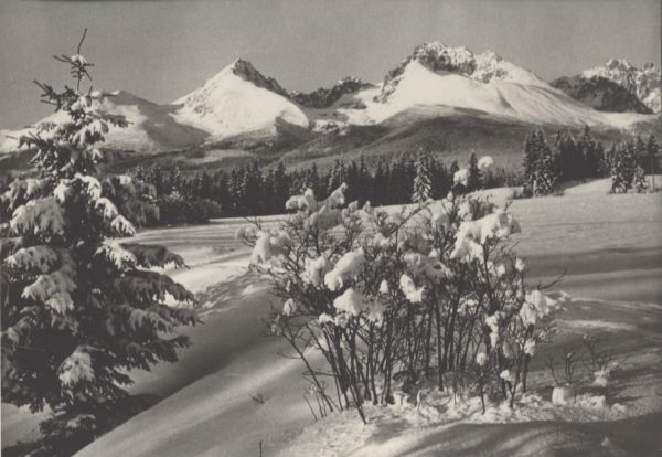 Widok na Kończystą, Batyżowiecki Szczyt i Gerlach w scenerii zimowej. Na pierwszym planie po prawej stronie krzewy, po lewej drzewo. W głębi las.