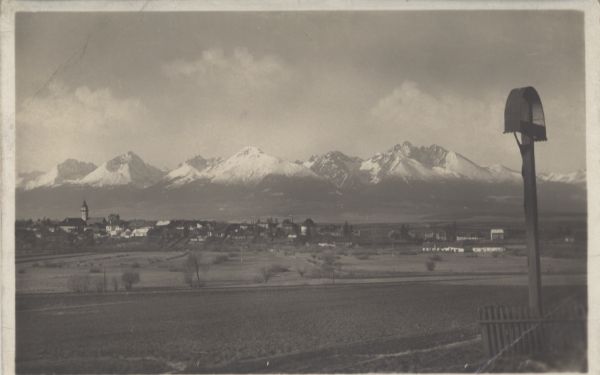 Panorama Tatr Wysokich. Od lewej: Kończysta, Gerlach, Staroleśny Szczyt, Sławkowski Szczyt i grupa Łomnicy. Poniżej osada Spiska Sobota. Po prawej stronie przydrożny krzyż.