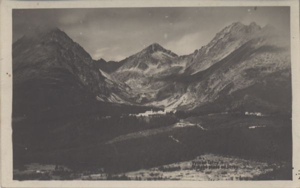 Widok ze Szczyrby na zabudowę Szczyrbskiego Jeziora i szczyty otaczaj±ce Dolinę Młynick±. Od lewej Solisko, Szczyrbski Szczyt i grań Baszt. Na dole po prawej stronie wpisany tytuł pocztówki.