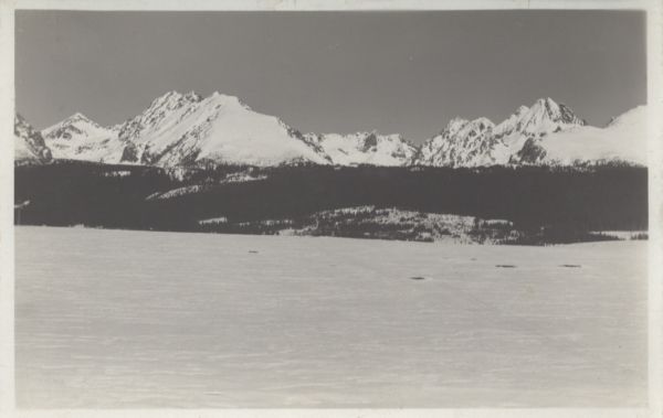 Zimowa panorama szczytów otaczających Szczyrbskie Jezioro. W tle od lewej: Szczyrbski Szczyt, Szatan, Skrajna Baszta, Wołowy Grzbiet, Kopa Popradzka, Wysoka, Osterwa. W głębi zabudowania Szczyrbskiego Jeziora