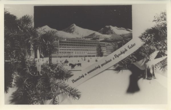 Kartka świąteczna. Zimowy widok na sanatorium w Wyżnich Hagach na tle Tępej, Kończystej i Gerlachu. Po obu stronach zdjęcia gałązki świąteczne. Pod zdjęciem życzenia: Vianočný a novorčný pozdrav z Vysokých Tatier.