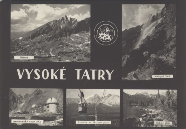 Pocztówka 5. elementowa. Na kolejnych zdjęciach przedstawiono: 1. Krywań, 2. Wodospad Skok, 3. Obserwatorium Astronomiczne Słowackiej Akademii Nauk w Dolinie Łomnickiej. 4. Kolej linową nad Łomnicki Staw, 5. Szczyrbskie Jezioro. W centralnej części napis: VYSOKÉ TATRY, powyżej logo Wysokich Tatr.