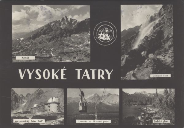 Pocztówka 5. elementowa. Na kolejnych zdjęciach przedstawiono: 1. Krywań, 2. Wodospad Skok, 3. Obserwatorium Astronomiczne Słowackiej Akademii Nauk w Dolinie Łomnickiej. 4. Kolej linową nad Łomnicki Staw, 5. Szczyrbskie Jezioro. W centralnej części napis: VYSOKÉ TATRY, powyżej logo Wysokich Tatr.