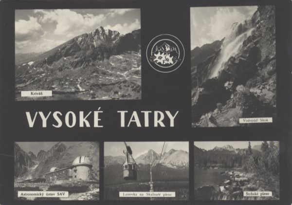 Pocztówka 5. elementowa. Na kolejnych zdjęciach przedstawiono: 1. Krywań, 2. Wodospad Skok, 3. Obserwatorium Astronomiczne Słowackiej Akademii Nauk w Dolinie Łomnickiej. 4. Kolej linową nad Łomnicki Staw, 5. Szczyrbskie Jezioro. W centralnej części napis: VYSOKÉ TATRY, powyżej logo Wysokich Tatr.