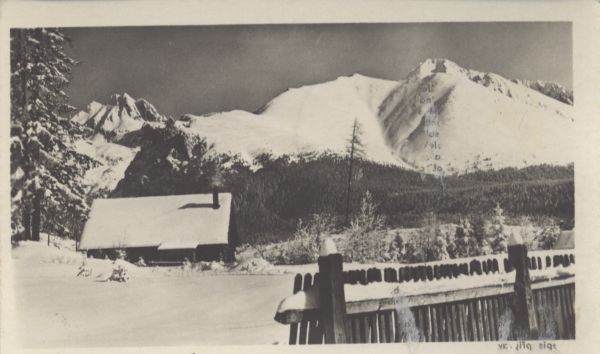 Zimowy pejzaż. Na pierwszym planie drewniany płot, w głębi dom otoczony lasem. W tle od lewej: Wysoka, Osterwa, Tępa i Kończysta.
