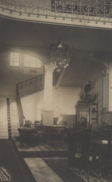 Wnętrze hotelu w Tatrzańskiej Łomnicy. W holu widoczny spreparowany okaz kozicy. Na dole po lewej stronie napisana informacja o fotografie (nieczytelna).
