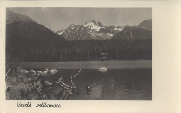 Widok na Nowe Szczyrbskie Jezioro i jego otoczenie. W tle szczyty, od lewej: Skrajna Baszta, Kopa Popradzka, Wysoka, Osterwa i Tępa. Pod zdjęciem życzenia: Veselé velikonoce.