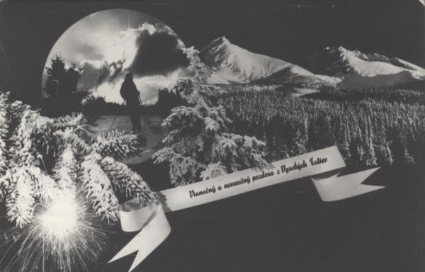 Kartka świąteczna. Fotomontaż. Po lewej stronie gałązka z szyszkami . W głębi narciarz na tle księżyca. Po prawej stronie Krywań i Ostra. Na dole życzenia: Vianočný a novorčný pozdrav z Vysokých Tatier.