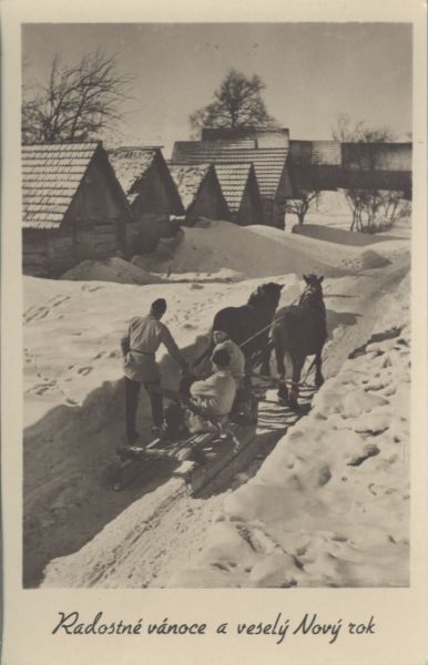 Wieś podtatrzańska zimą. 3 górali na saniach zaprzęgniętych w 2 konie. W tle zabudowania wiejskie. Pod zdjęciem życzenia: Radostné vánoce a veselý Nový rok.