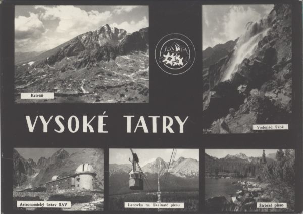 Pocztówka 5. elementowa. Na kolejnych zdjęciach przedstawiono: 1. Krywań, 2. Wodospad Skok, 3. Obserwatorium Astronomiczne Słowackiej Akademii Nauk w Dolinie Łomnickiej. 4. Kolej linową nad Łomnicki Staw, 5. Szczyrbskie Jezioro. W centralnej części napis: VYSOKÉ TATRY, powyżej logo Wysokich Tatr.