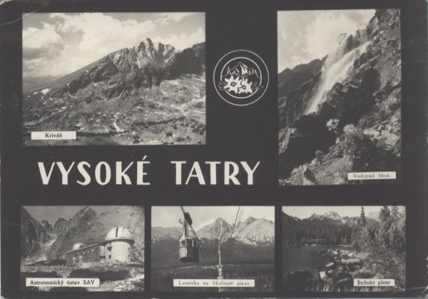 Pocztówka 5. elementowa. Na kolejnych zdjęciach przedstawiono: 1. Krywań, 2. Wodospad Skok, 3. Obserwatorium Astronomiczne Słowackiej Akademii Nauk w Dolinie Łomnickiej. 4. Kolej linową nad Łomnicki Staw, 5. Szczyrbskie Jezioro. W centralnej części napis: VYSOKÉ TATRY, powyżej logo Wysokich Tatr.