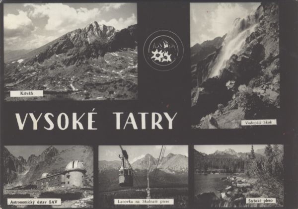 Pocztówka 5. elementowa. Na kolejnych zdjęciach przedstawiono: 1. Krywań, 2. Wodospad Skok, 3. Obserwatorium Astronomiczne Słowackiej Akademii Nauk w Dolinie Łomnickiej. 4. Kolej linową nad Łomnicki Staw, 5. Szczyrbskie Jezioro. W centralnej części napis: VYSOKÉ TATRY, powyżej logo Wysokich Tatr.