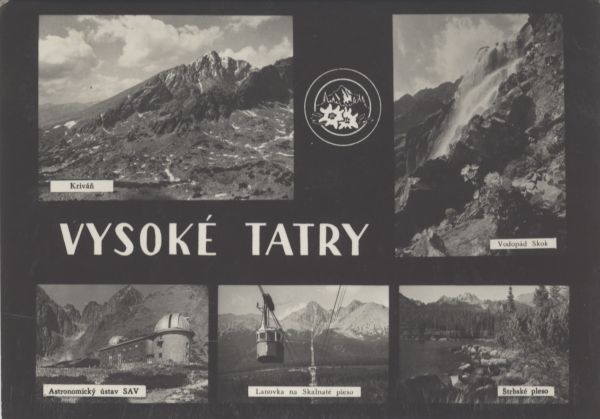 Pocztówka 5. elementowa. Na kolejnych zdjęciach przedstawiono: 1. Krywań, 2. Wodospad Skok, 3. Obserwatorium Astronomiczne Słowackiej Akademii Nauk w Dolinie Łomnickiej. 4. Kolej linową nad Łomnicki Staw, 5. Szczyrbskie Jezioro. W centralnej części napis: VYSOKÉ TATRY, powyżej logo Wysokich Tatr.