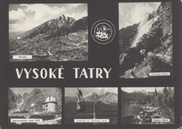 Pocztówka 5. elementowa. Na kolejnych zdjęciach przedstawiono: 1. Krywań, 2. Wodospad Skok, 3. Obserwatorium Astronomiczne Słowackiej Akademii Nauk w Dolinie Łomnickiej. 4. Kolej linową nad Łomnicki Staw, 5. Szczyrbskie Jezioro. W centralnej części napis: VYSOKÉ TATRY, powyżej logo Wysokich Tatr.
